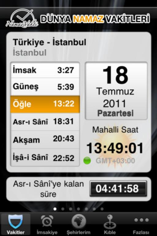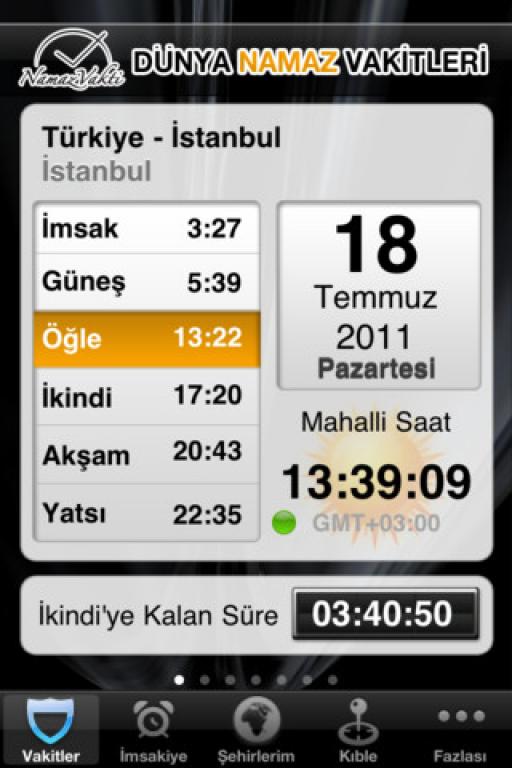 Tamamen ücretsiz olarak iPad ve iPhone akıllı cihazlarınızda kullanabileceğiniz uygulama sayesinde Dünya' nın neresinde olursanız olun bulunduğunuz ülkenin namaz vakitlerini öğrenebilir ve ibadetinizi bu vakite göre gerçekleştirebilirsiniz. Ayrıca uygulamada bulunan Kıble tayini ve imsakiye özelliklerini de kullanabilirsiniz.